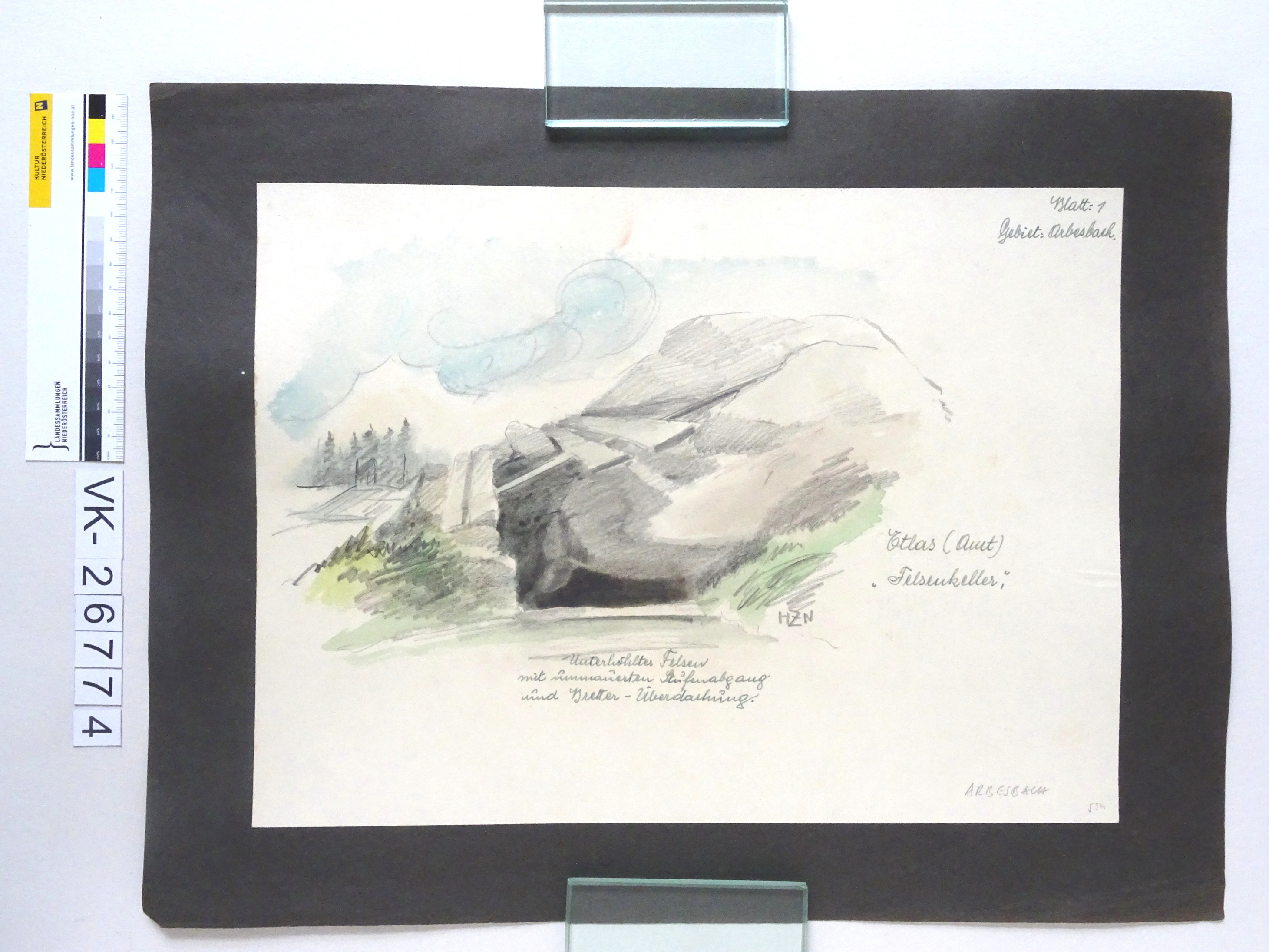 Zeichnung aus der Serie Waldviertler Heimatbilder: "Blatt 1: Gebiet Arbesbach, Atlas (Amt) "Felsenkeller", Unterhöhlter Felsen mit ummauerten Stufenabgang und Bretter-Überdachung, HZN"; signiert, kaschiert auf Karton; 554, 6/4;