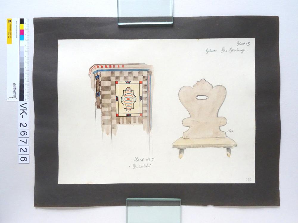 Zeichnung aus der Serie Waldviertler Heimatbilder: "Blatt 3: Gebiet Groß Gerungs, Haid Nr. 7 "Grasruck"; HZN"; Teilansicht eines bemalten Kastens, Stuhllehne; signiert, kaschiert auf Karton; 326, 24/9