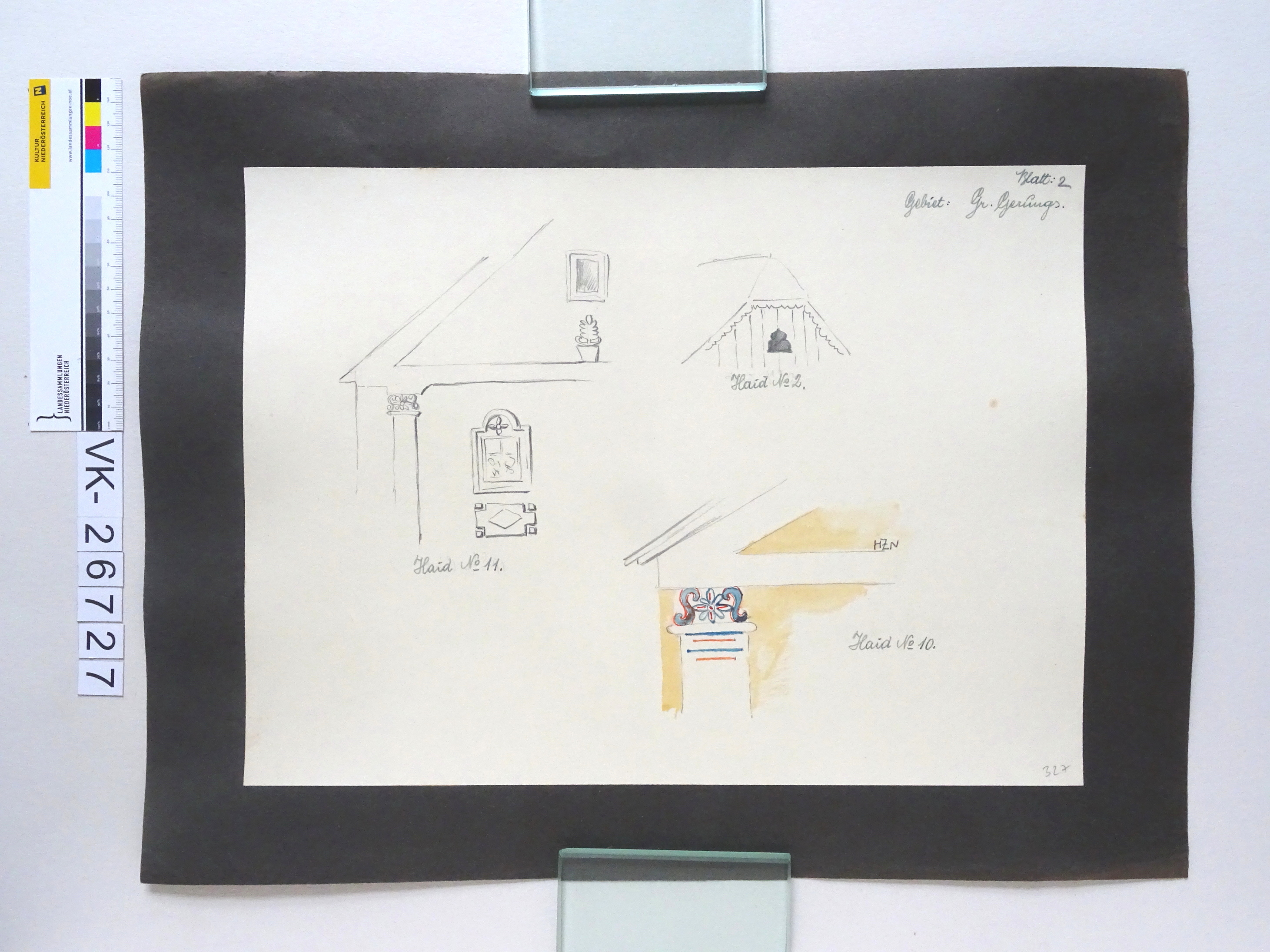 Zeichnung aus der Serie Waldviertler Heimatbilder: "Blatt 2: Gebiet Groß Gerungs, Haid Nr. 11, Haid Nr. 2, Haid Nr. 10; HZN"; Reliefdekor, Giebelschalung, Giebelverzierung; signiert, kaschiert auf Karton; 327, 24/9