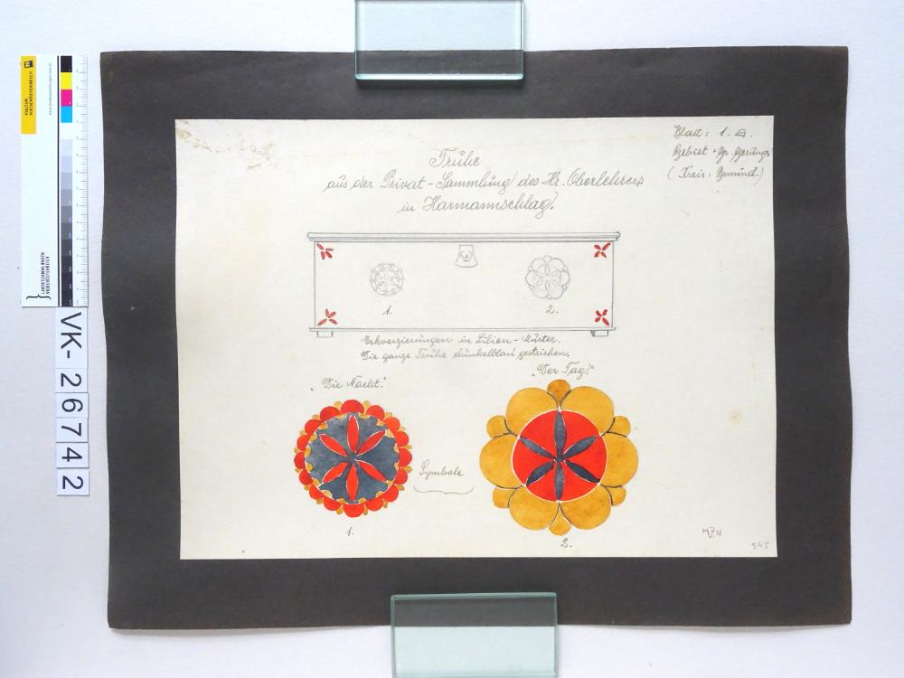Zeichnung aus der Serie Waldviertler Heimatbilder: "Blatt 1a; Gebiet Groß Gerungs (Kreis: Gmünd), Truhe aus der Privatsammlung des Hr. Oberlehrers in Harmannschlag; HZN"; Verzierungen: Lilie, Symbole für " die Nacht, der Tag"; signiert, kaschiert auf Karton; 345