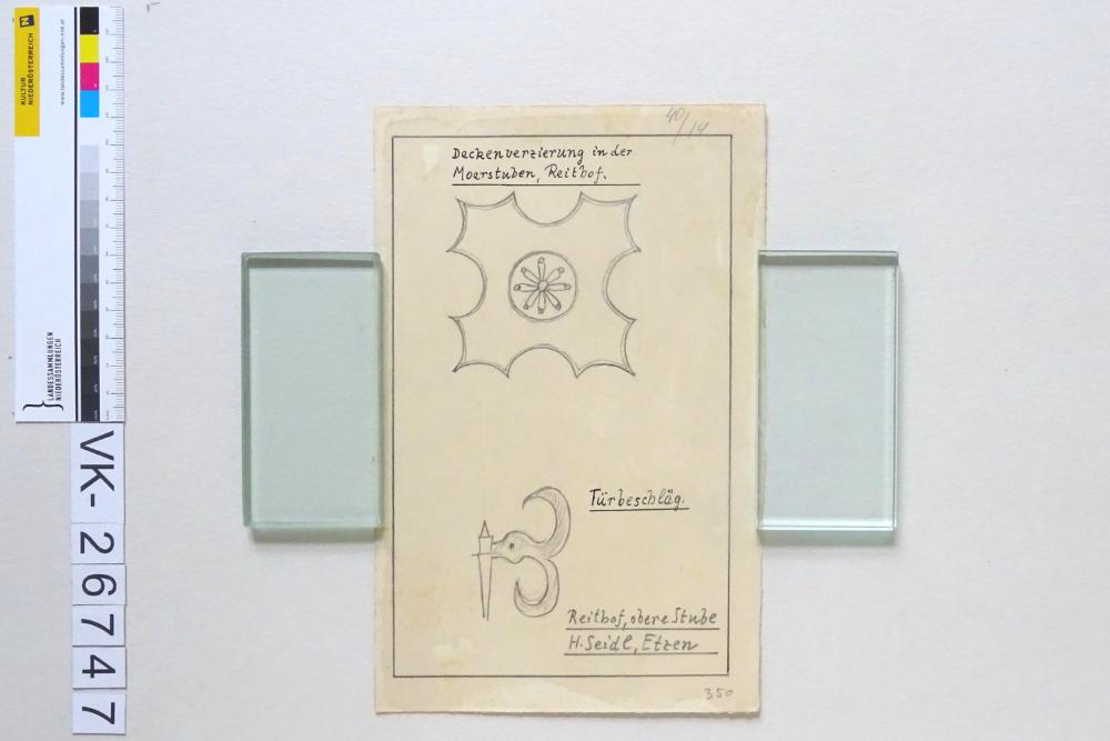 Zeichnung aus der Serie Waldviertler Heimatbilder: "Etzen, Reithof, obere Stube, Deckenverzierung in der Moarstube, Türbeschlag; H. Seidl"; Groß Gerungs; signiert; 350, 40/14