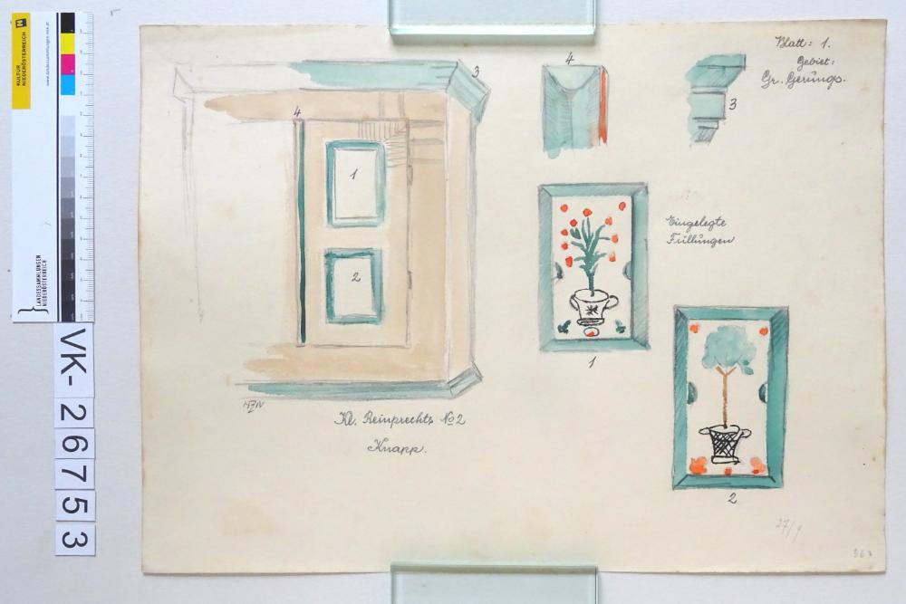 Zeichnung aus der Serie Waldviertler Heimatbilder: "Gebiet Groß Gerungs, Klein Reinprechts Nr. 2 "Knapp", eingelegte Füllungen; HZN"; Teilansicht eines bemalten Kastens, Blumentopf; signiert; 363, 27/9