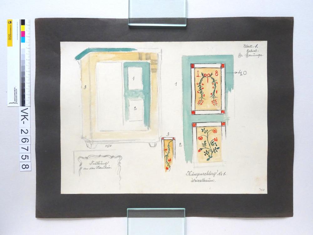 Zeichnung aus der Serie Waldviertler Heimatbilder: "Blatt 1: Gebiet Groß Gerungs, Künzenschlag Nr. 1 "Weixelbaum", "1840"; Füllung an der Hau(s)tür; HZN"; Teilansicht eines bemalten Kastens (datiert 1840); Kinzenschlag; signiert, kaschiert auf Karton; 368, 49/9