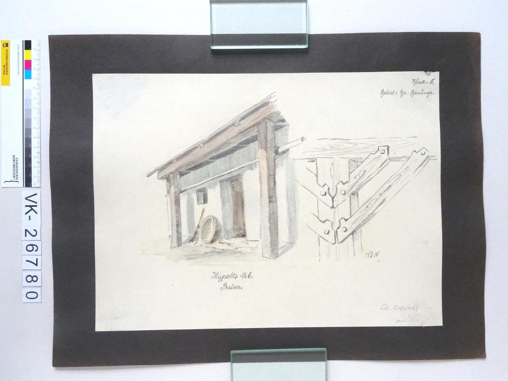 Zeichnung aus der Serie Waldviertler Heimatbilder: "Blatt 5: Gebiet Groß Gerungs, Hypolts Nr. 6 Preiser, HZN"; signiert, kaschiert auf Karton; 542, 25/9;