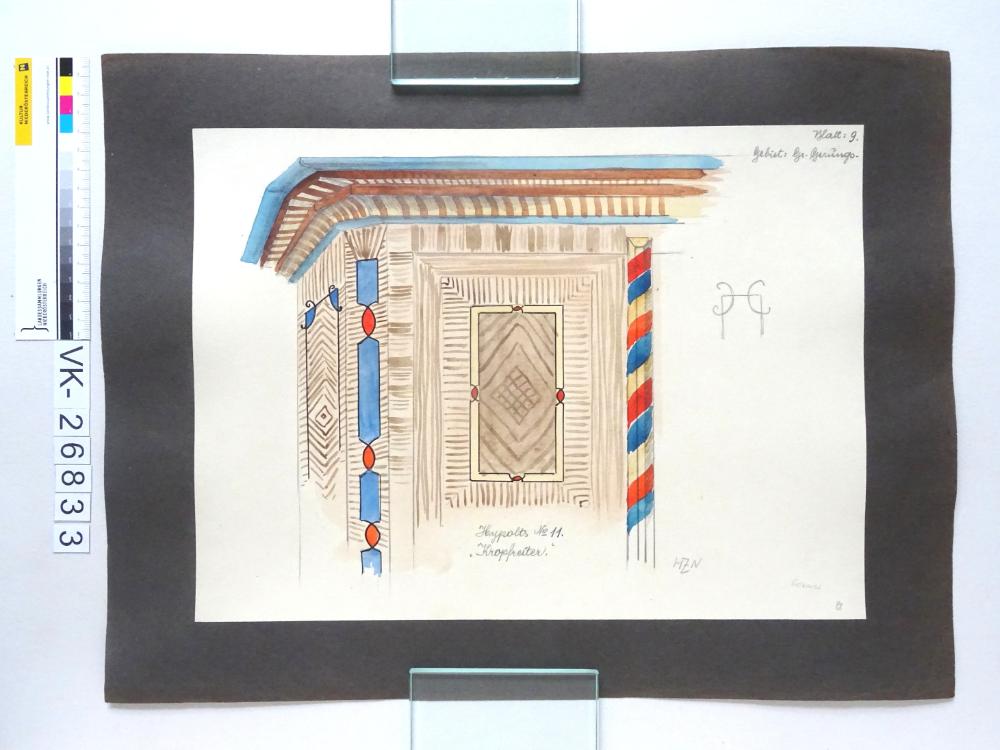 Zeichnung aus der Serie Waldviertler Heimatbilder: "Blatt 9: Gebiet Groß Gerungs; Hypolts Nr. 11 "Kropfreiter"; "HZN"; signiert, kaschiert auf Karton; Teilansicht eines bemalten Kasten; 88, 34/9