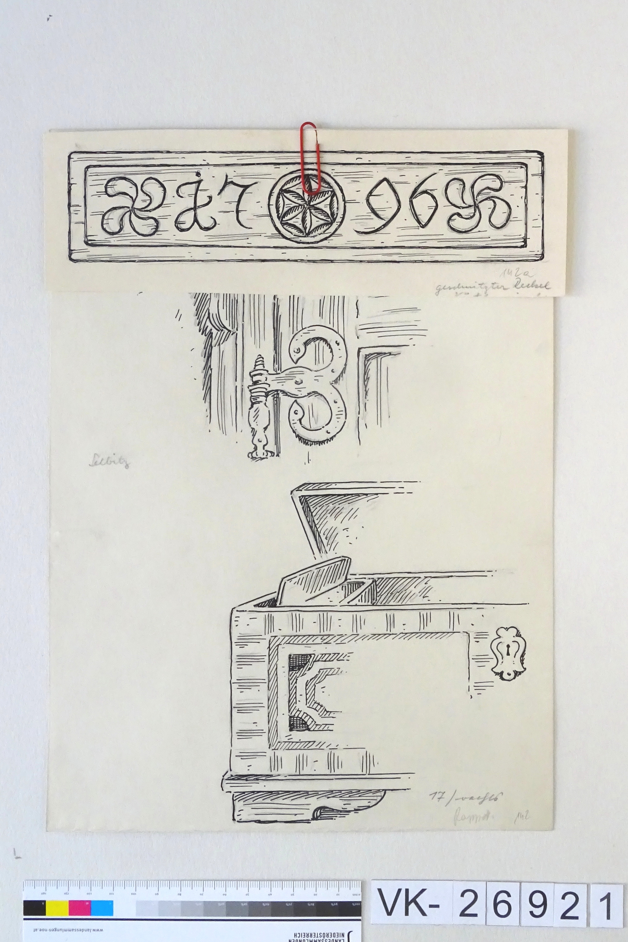 Zeichnung aus der Serie Waldviertler Heimatbilder: "Selbitz: Türstock, Truhe "1796"; MN"; signiert; Türstock, Türbrett (Regalbrett mit Buch, Dose), Teilansicht geöffnete Truhe; beschnitzter Truhendeckel (Sonnensymbol, 1796); 2 Blätter mit Büroklammer zusammen geheftet; Rappottenstein; 142, 142a, 17/rechts