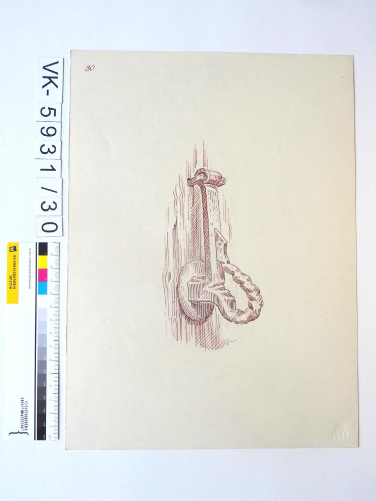 Zeichnung aus der Serie Waldviertler Heimatbilder: "Blatt 30: Schmiedeeiserner Türklopfer, Motiv der Gesundheit und Glück hütender Hausschlange, Riebeis"