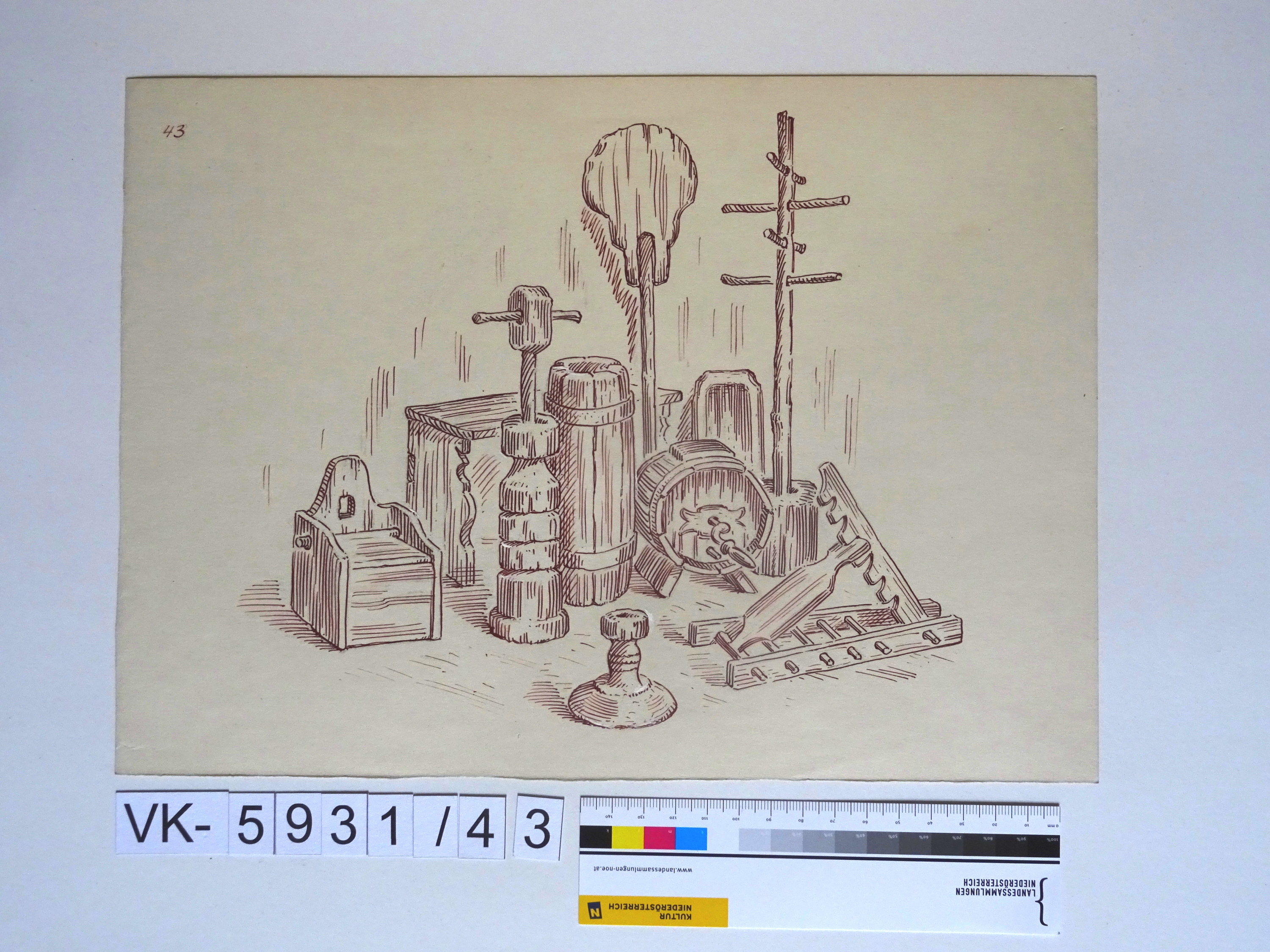 Zeichnung aus der Serie Waldviertler Heimatbilder: "Blatt 43: Hölzernes Arbeitsgerät: Salzkistl, Mohnstößl, Butterfaß, Schuss-Schaufel zum Einschieben des Brotes in den Backofen, Butterfass mit Handkurbel, dahinter an die Wand gelehnt längliche Aschenschale für den Backofen, Selchsprudler zum Aufhängen der Selchfleischstücke "Selchrenkerln", davor Kartoffelleiter zum Auspressen der Kartoffeln für die "rupfenen" Knödel, in der Mitte vorne handgeschnitzter Leuchter"