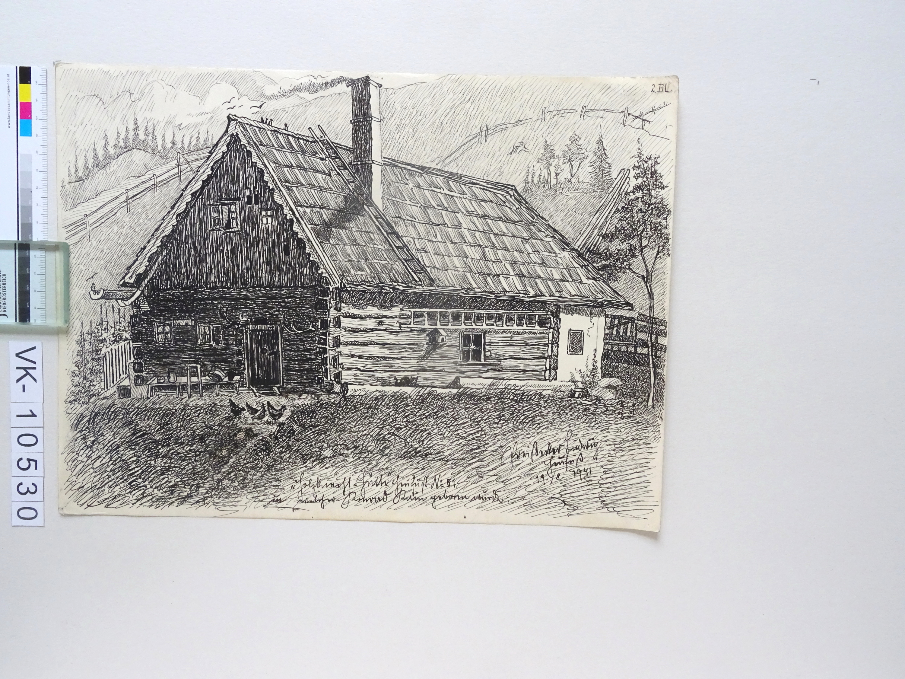 Zeichnung aus der Serie Waldviertler Heimatbilder: "Blatt 2: Holzknecht-Hütte Haufuß Nr. 51, in welcher Konrad Kain geboren wurde; Ludwig Preißcker 19.8.1941"; signiert und datiert