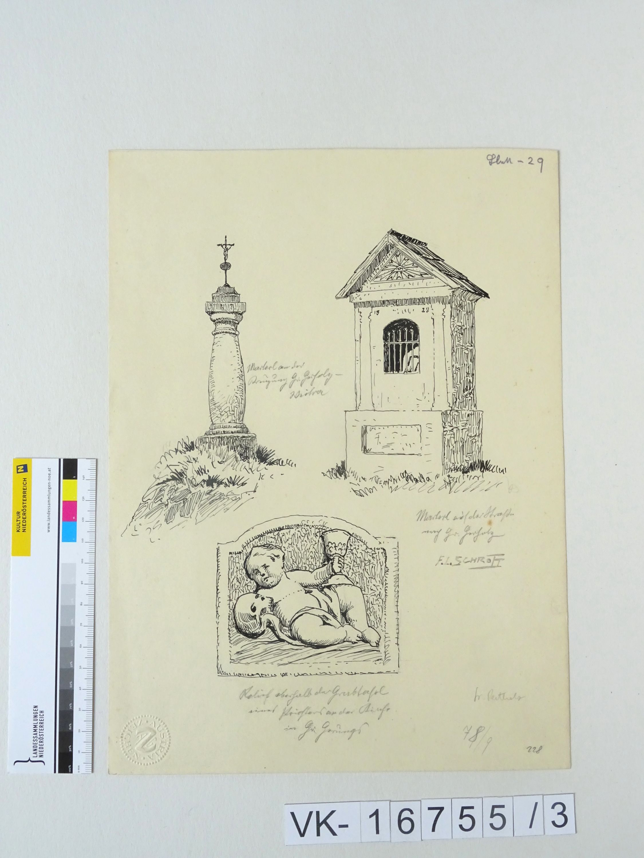 Zeichnung aus der Serie Waldviertler Heimatbilder: "Blatt 29: Marterl an der Kreuzung Groß Pertholz - Weitra; Marterl an der Strasse nach Groß Pertholz; Relief oberhalb der Grabtafel xxx in Groß Pertholz"; signiert; 228