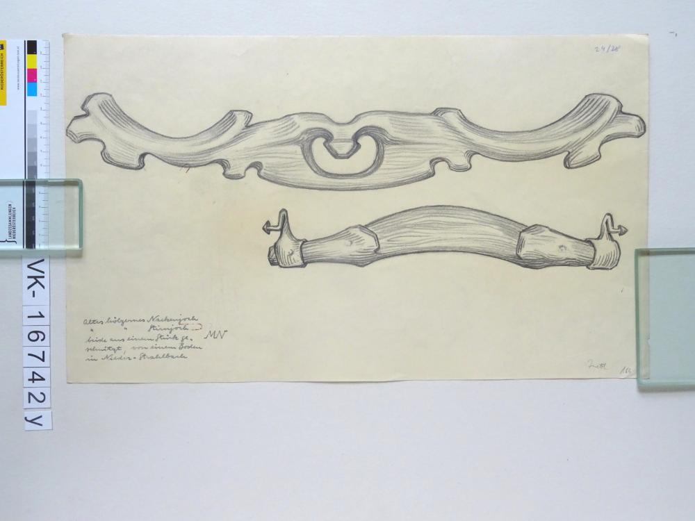Zeichnung aus der Serie Waldviertler Heimatbilder: "Zwettl, altes hölzernes Nackenjoch, altes hölzernes Stirnjoch, beide aus einem Stück geschnitzt, von einem Boden in Nieder-Strahlbach", MN"; signiert; 166, 24/28