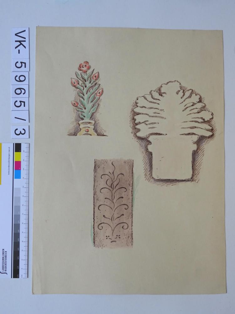 Zeichnung aus der Serie Waldviertler Heimatbilder: "Lebensbaum-Motiv aus dem Waldviertel: links oben: bemaltes Stuckmotiv an einem Hausgesimse, Erdweis; rechts: Stuckmotiv über einer Tür, Gradnitz; unten: Motiv am Mittelteil der schiedeeisernen Tür eines Friedhofes in Nieder-Grünbach; MN", signiert