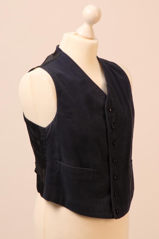 Blaue Weste mit schwarzen Knöpfen und zwei Leistentaschen, dunkelblauer Futterrücken mit Dragoner. Futter in weiß/hellblauen Streifen.