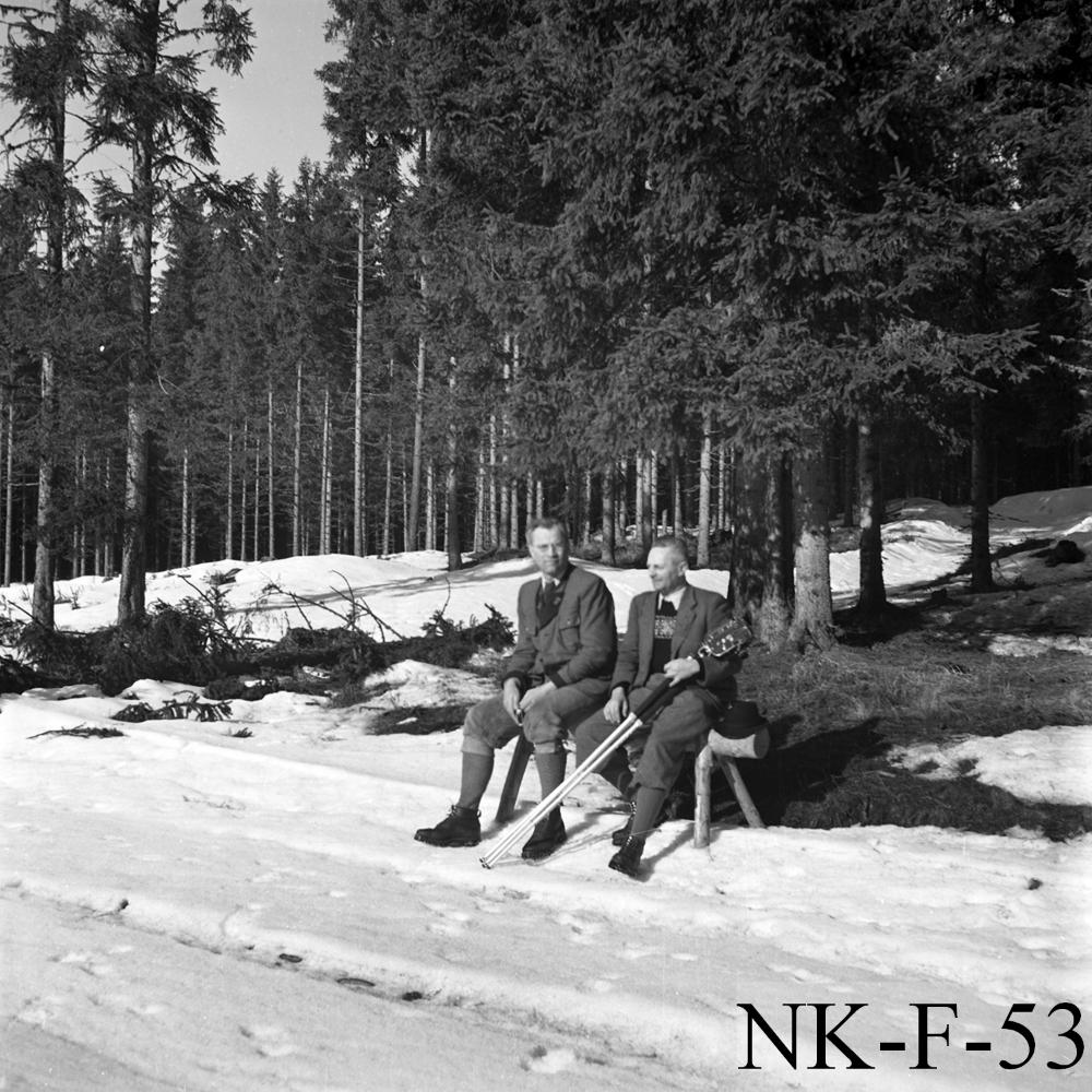 Lothar Machura (links mit Kamera) und Augustin Meisinger (rechts), auf einer Rastbank sitzend, Winterlandschaft im Nadelwald