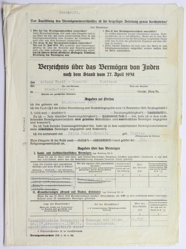 "Verzeichnis über das Vermögen von Juden" - Familie Fantl-Brumlik