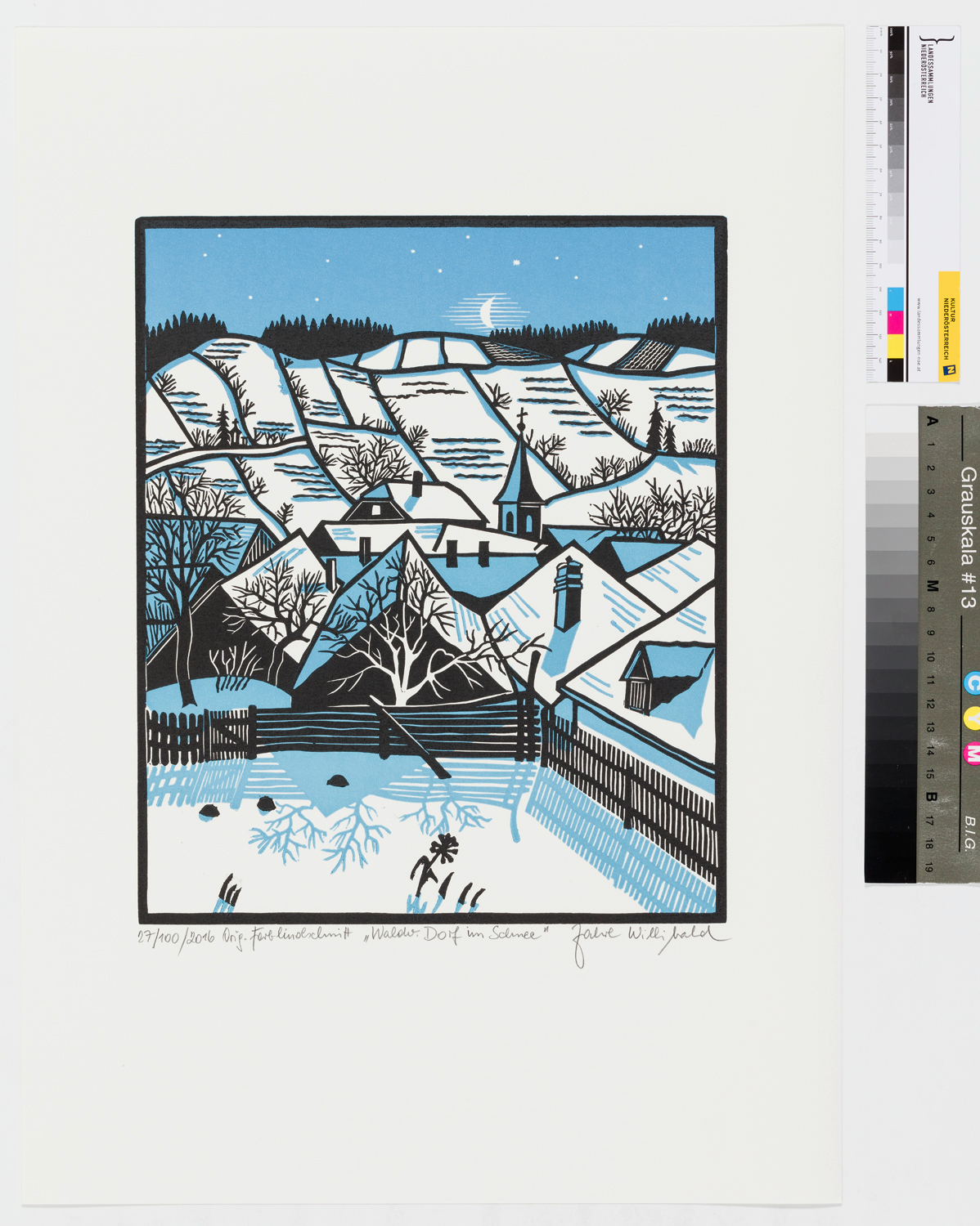 SignaturVS. li. unten numm., dat. u. bez., Mi. unten bet., re. unten sign.: "27/100/2016, Orig. Farblinolschnitt, "Waldv. Dorf im Schnee", Zahrl Willibald"