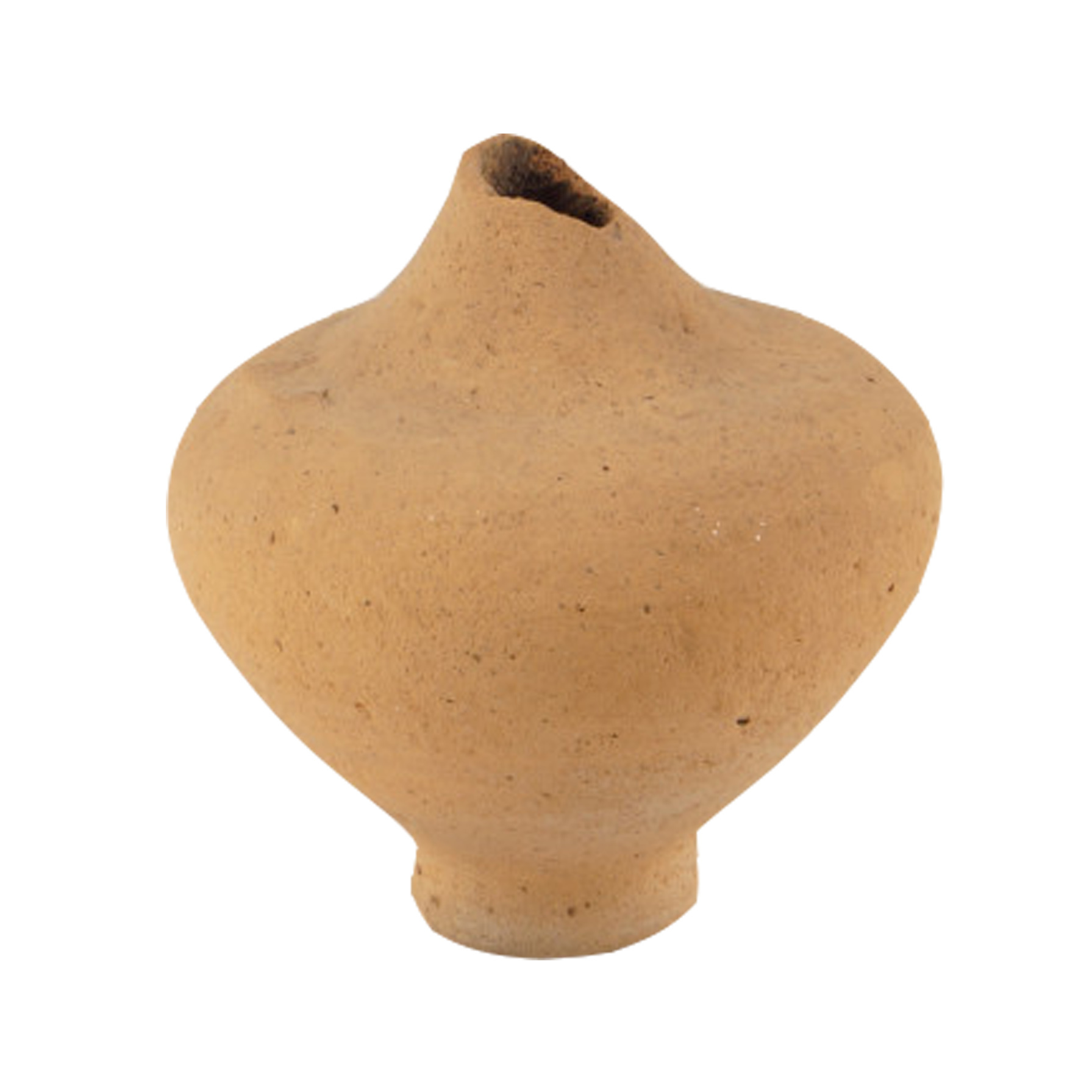 Gefäßkörper eines bauchigen einhenkeligen Kruges mit schmaler Standfläche. Oxidierend gebrannte Keramik.