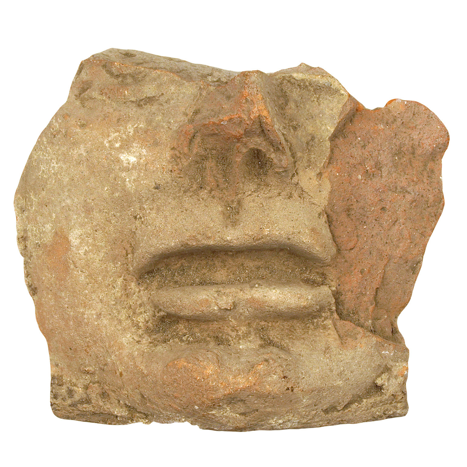 Fragment eines Stirnziegels in Form einer weiblichen Maske. Zu erkennen sind Teile der Augenpartie und der Nase sowie der geöffnete Mund und ein hervortretendes Kinn.
