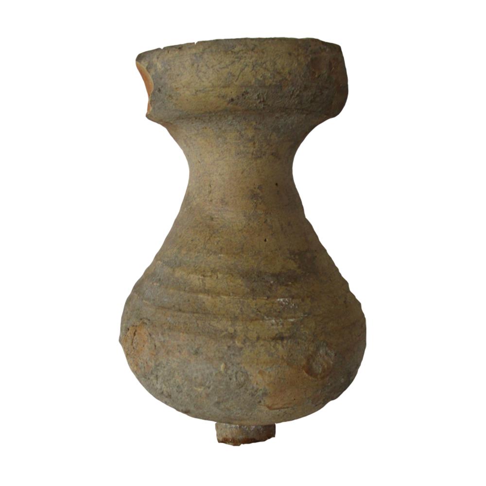 Miniaturgefäß. Intakte Ganzform, birnenförmig, weit ausladender eingesattelter Rand, außen Drehrillen, zylindrischer Fuß.