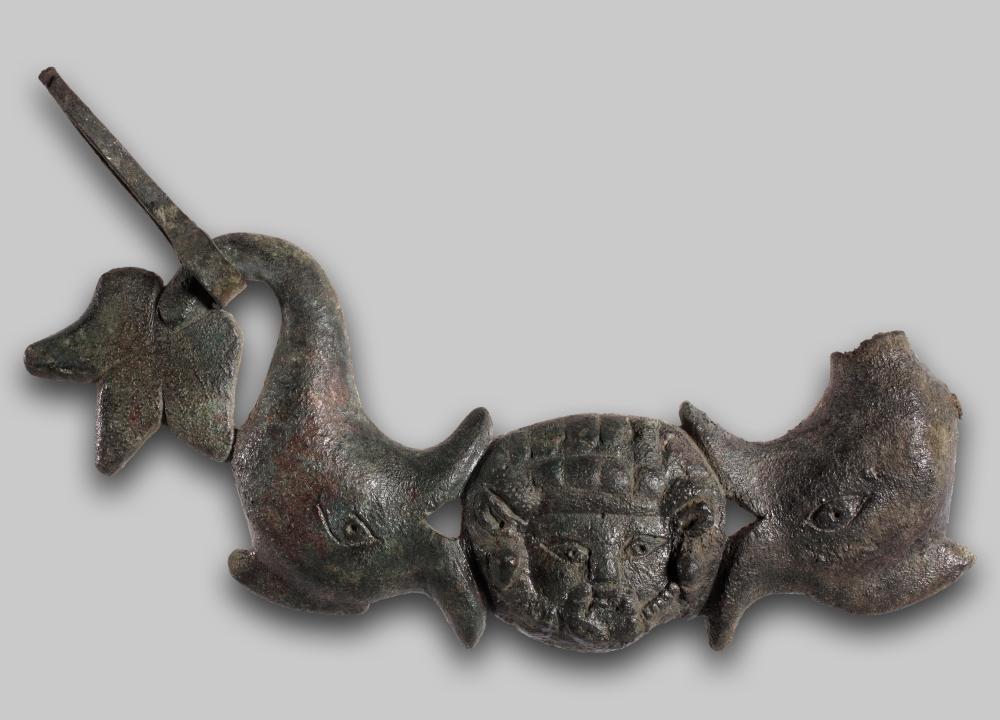 Der Kassetten- oder Truhengriff ist in Form zweier antithetisch angeordneter Delphine gestaltet, die zwischen ihren geöffneten Mäulern eine Maske des Iuppiter Ammon fassen.