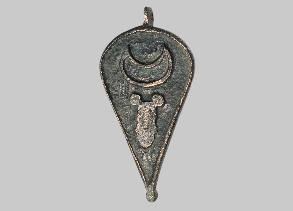 Blattförmige Kapsel mit Deckel. Auf der Deckeloberseite erkennt man einen Phallus und eine mit den Spitzen nach oben zeigende Mondsichel. Die ursprüngliche Emaileinlage in der Lunula ist nicht mehr erhalten.