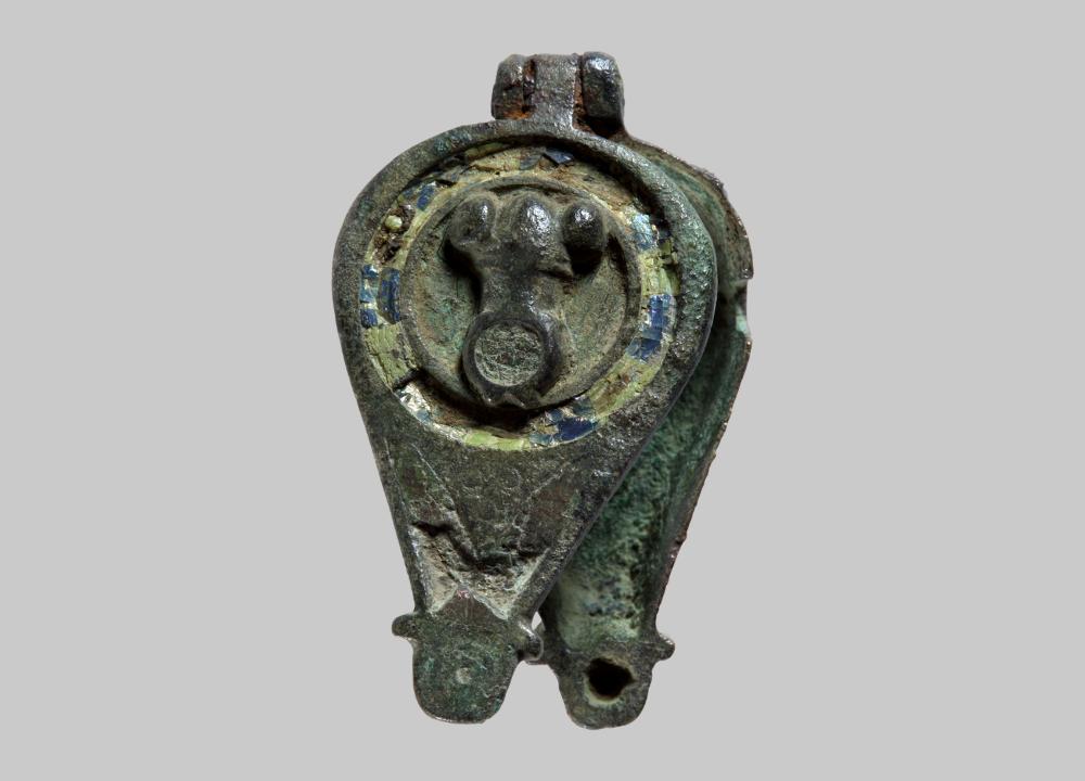 Geöffnete Siegelkapsel mit Dekor an Ober- und Unterseite. Auf der einen Seite erkennt man einen kleinen Phallus, der sich innerhalb eines Doppelkreises befindet. Dieser Kreis wurde durch abwechselnde gelbe und blaue Emaileinlagen besonders gestaltet. Die andere Seite trägt eine einfachere Verzierung, die aus drei Kreisaugen besteht.