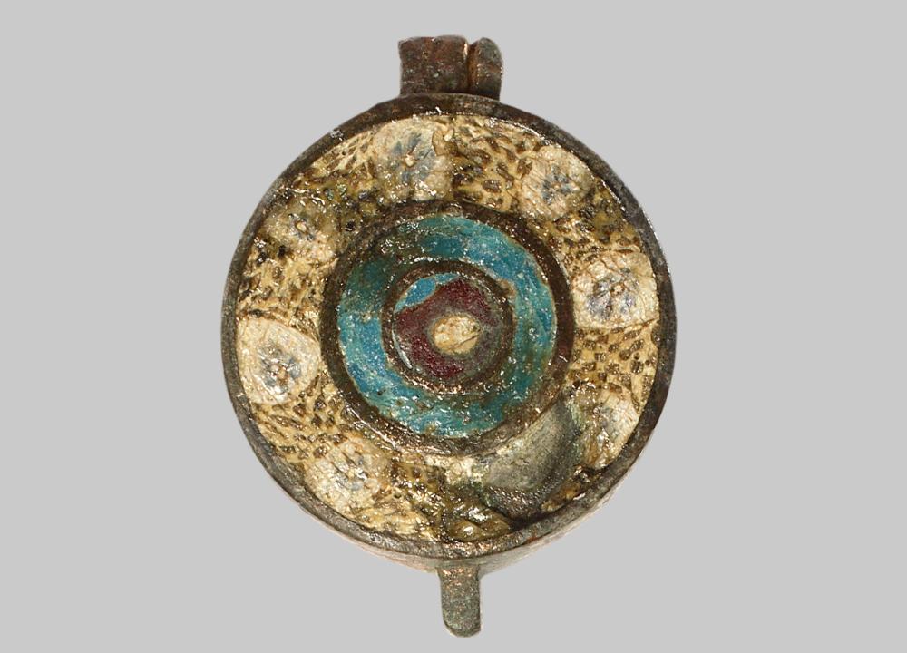 Rund. Auf Deckeloberseite drei kreisrunde Vertiefungen mit Emaileinlegearbeit (weiß, rot, türkis, blau, braun?). Felder mit Schachbrettmuster im äußeren Kreis.