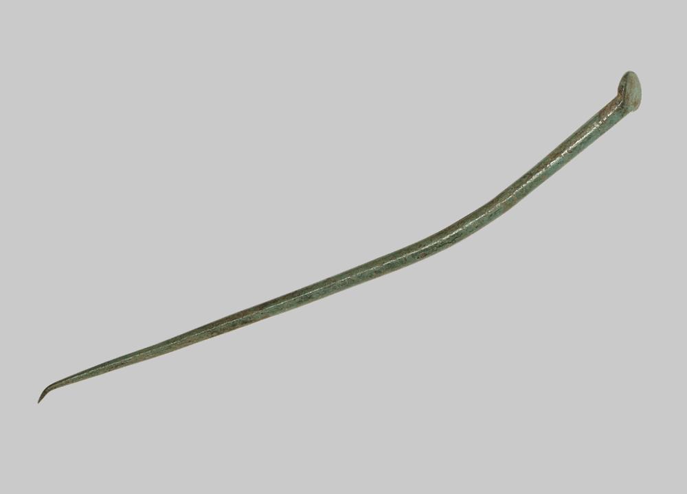Unverzierter glatter Stiel. Spitzes Ende. Flache, geknickte Laffe.