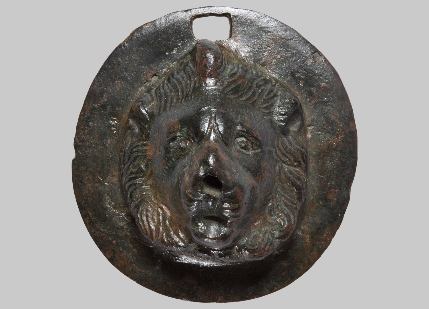 Die kreisrunde Scheibe mit rechteckiger Aufhängeöse hat einen glatten breiten Rand. Im Zentrum befindet sich ein stark plastisch hervortretender Löwenkopf. Man erkennt eine fein gegliederte Löwenmähne, die das Gesicht umfasst. Im Bereich der Schnauze befindet sich ein Loch.