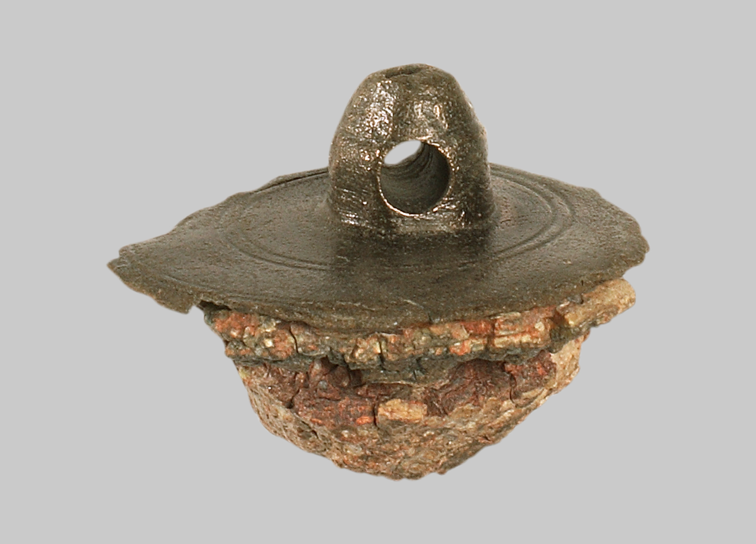 Oberer Teil eines Lotes mit gelochter Aufhängevorrichtung und eingekerbten doppelten Kreislinien auf der Oberfläche. Der untere Lotkörper ist weggebrochen. Nur mehr Reste der Bleifüllung erhalten.