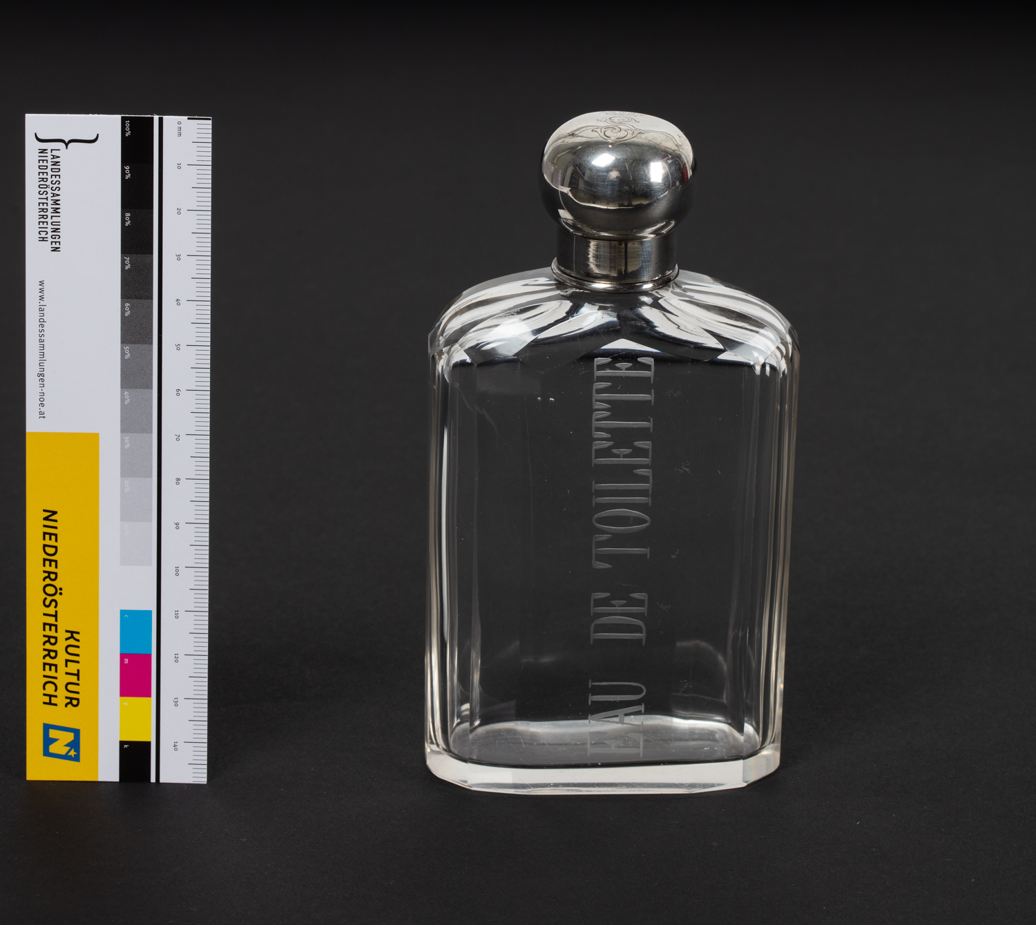 Flacon aus facettiert geschliffenem, farblosem Glas, glatte Wandung mit runder Schulter, Inhaltsangabe graviert, Schliffstopfen mit facettiert geschliffener Handhabe und Silbermontierungen mit verschraubbarem Deckel in Form einer gestauchten Kugel, Silbermontierung innen mit resten von Vergoldung, mit gravierter Chiffre S und Herzogshut