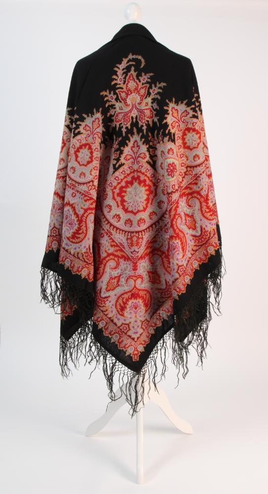 Schwarzes Tuch mit breiter, floral-ornamentalen Bordüre und zwei Eckelementen in Rot/Orange/Violett/Hellgrün. Geheftete Schnittkanten mit geknüpften Fransen.