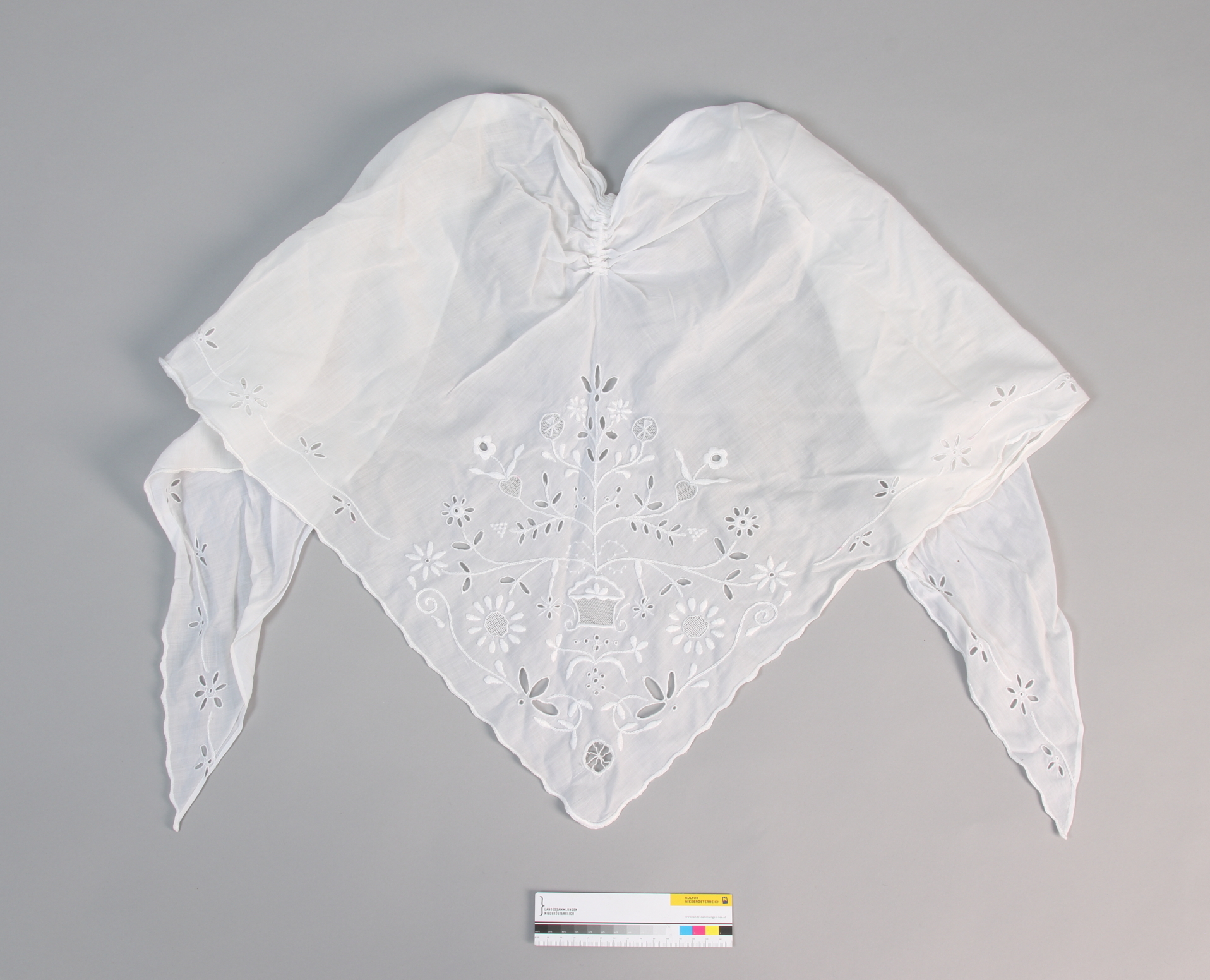 Weißes Dreieckstuch aus Leinenbatist mit Weißstickerei und Tülleinsätzen, Lebensbaum als Eckmotiv, seitlich Blumenranken und geschlungene Kanten. Im Rückenausschnitt mit Bändchen gerafft