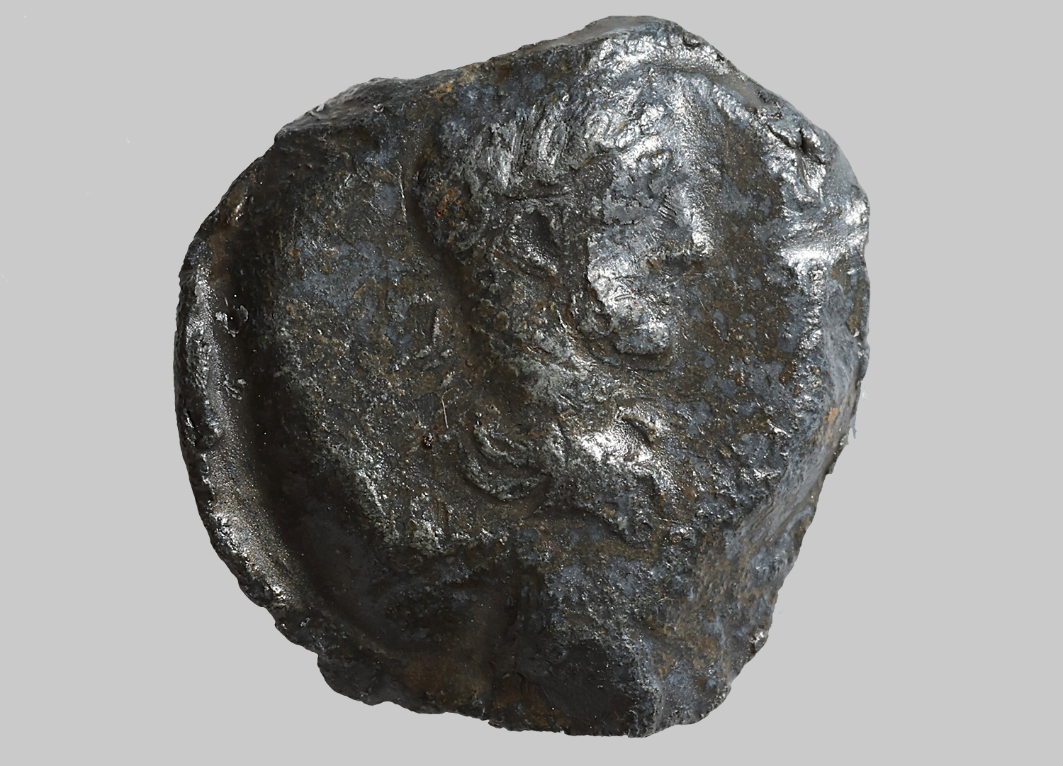 Runde Plombe mit rundem Stempel; männlicher Kopf, im Profil nach rechts; Gesichtszüge nicht deutlich ausgeprägt, bartlos, mit gerader Nase und ausgeprägtem Überaugenwulst; im Kurzhaar markanter Lorbeerkranz erkennbar; Stempel am Rand erhaben, scheint von beiden Seiten zusammengeprässt worden zu sein, senkrechte breite Durchlochung