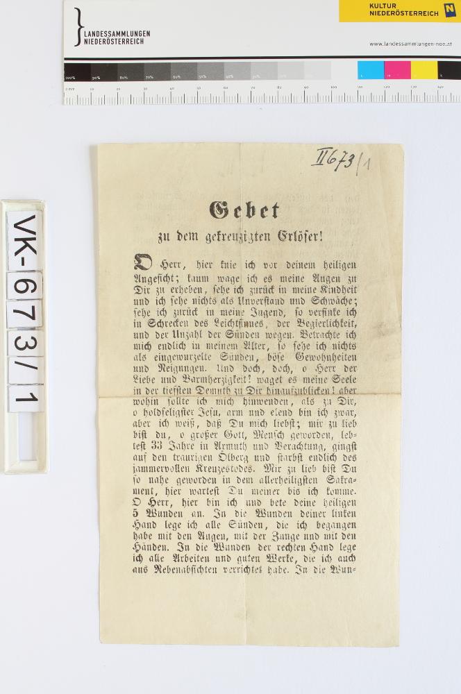 Leiden Christi; 1 Blatt: "Gebet zu dem gekreuzigten Erlöser!", "Wien, 1857, gedruckt bei Leopold Grund"; Eintrag Inventarbuch: "Christi Leiden, Gebete"