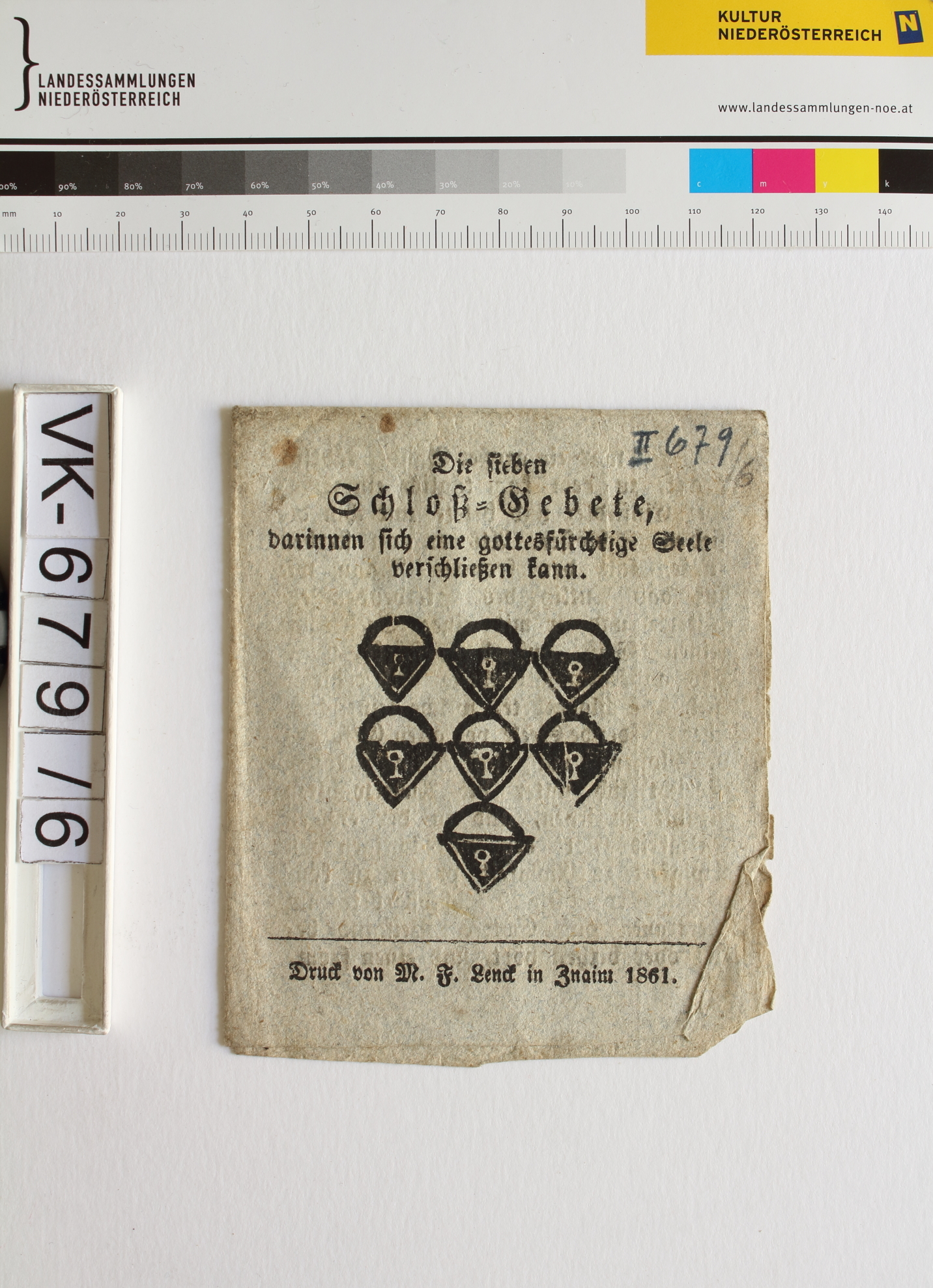 Schloßgebeter; 1 Blatt, doppelt gefaltet: "Die sieben Schloß=Gebete, darinnen sich eine gottesfürchtige Seele verschließen kann", "Druck von M. F. Lenk in Znaim 1861", Abbildung: 7 Schlösser; Eintrag Inventarbuch: "7 Himmelsriegeln und 7 Schloßgebeter"