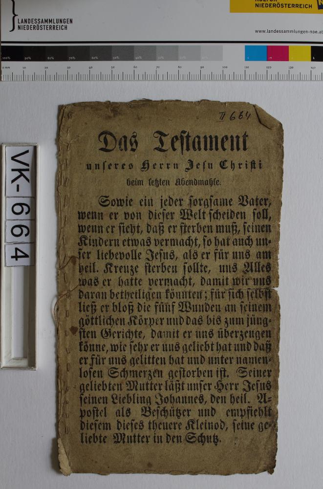 Testament Christi; 1 Blatt, geheftet: "Das Testament unseres Herrn Jesu Christi beim letzten Abenmahle", "Druck Jos. Berger in Leitomischl 1870"; Eintrag Inventarbuch: "Testament Christi"