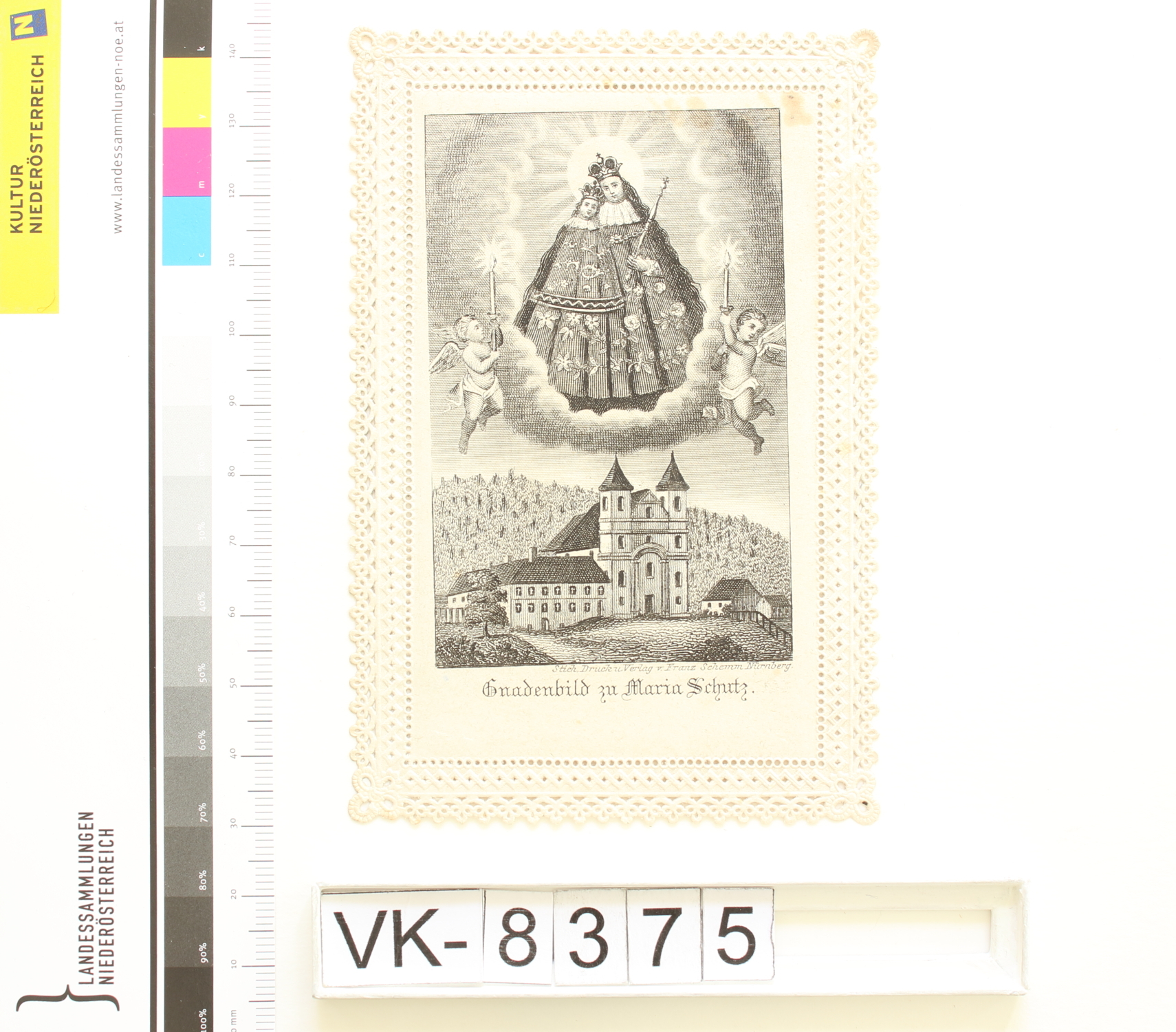 Schottwien, "Maria Schutz" im Semmeringgebiet; Vorderseite: Gnadenbild = Maria mit Kind, Wallfahrtskirche, Engel, "Gnadenbild zu Maria Schutz", "Stich, Druck u. Verlag v. Franz Schemm Nürnberg"; Rückseite: "Gebet zur Mutter Gottes", handschriftlich "26.7.886" und "31.7.59/ S-.25 FM", "Franz Schemm Nürnberg"; Eintrag Inventarbuch: Gebetszettel, Stahlstich, Slg. Klar.