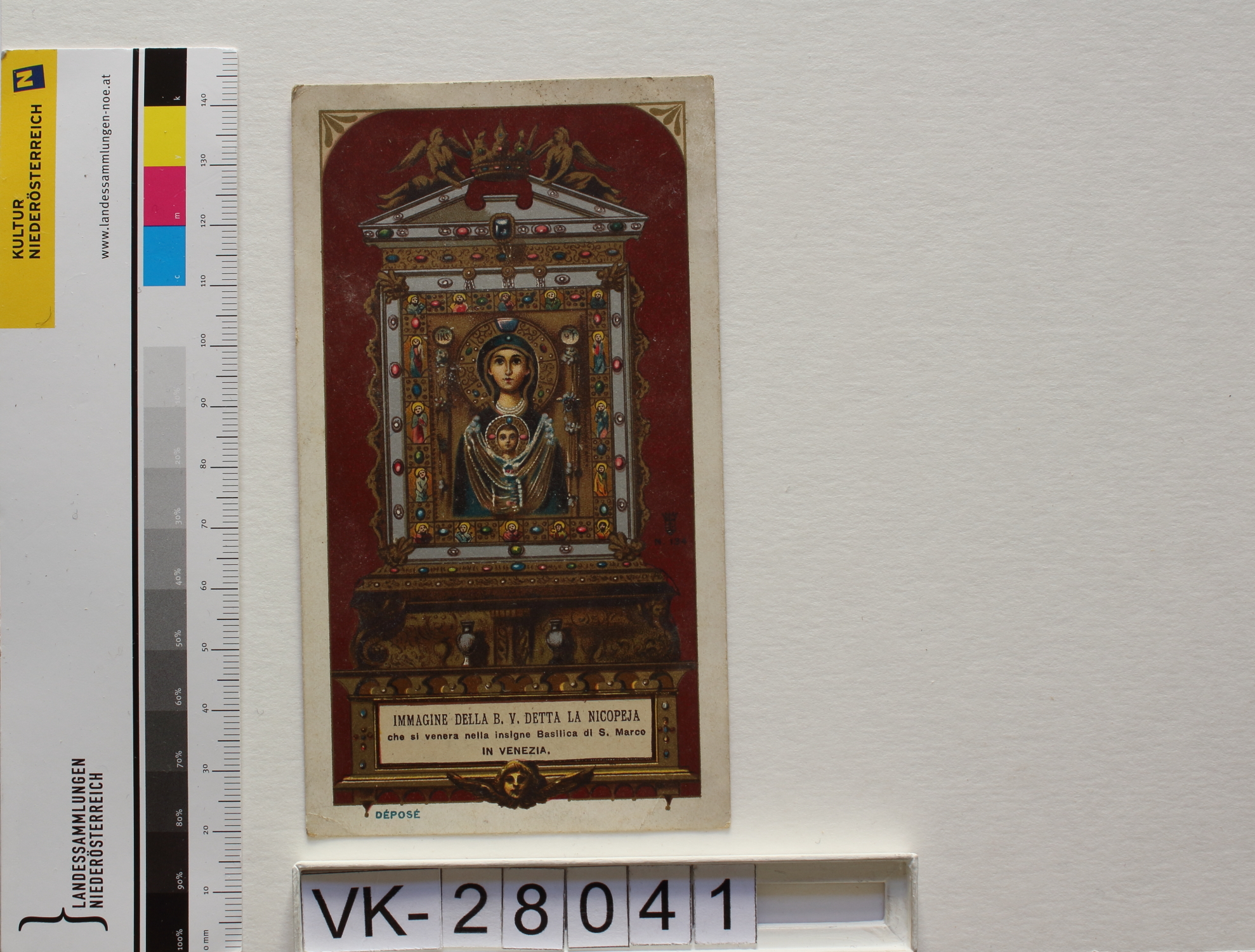 Hl. Maria; Vorderseite: Maria mit Kind, als siegeiche Jungfrau "Immagine della b. v. detta la Nicopeja/ che si venera nella insigne Basilica di S. Marco in Venezia", "Déposé"; Rückseite: "Orazione alla Beata Vergine detta Nicopeja", "Imprimatur: …26. Januari 1899...."