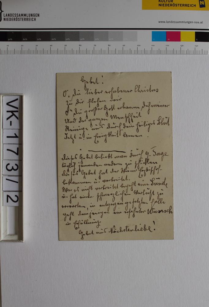 Schneeballengebet; 1 Blatt: handschriftlich "Gebet/ Gebet aus Nächstenliebe (Vorderseite); An Frau Therese Kroschneider im Jänner 1901 brieflich anonym geschickt worden"; Eintrag Inventarbuch: "Schneeballengebet"