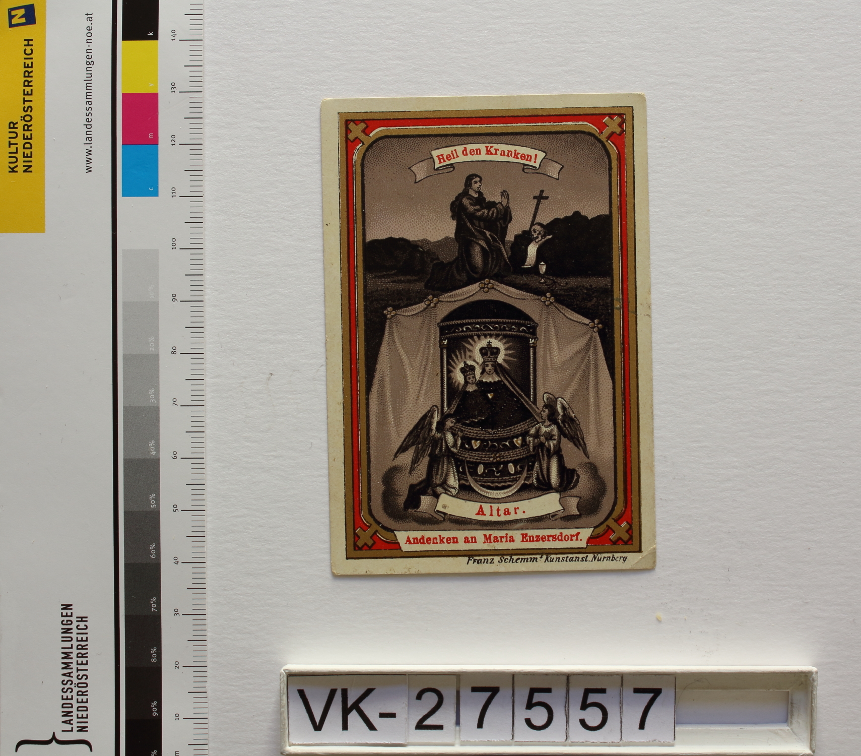 Maria Enzersdorf, "Maria Heil der Kranken"; Vorderseite: Gnadenstatue = Maria mit Kind, Maria Magdalena (Büßerin), Altar, Engel, "Heil den Kranken", "Altar", "Andenken an Maria Enzersdorf", "Franz Schemm`s Kunstanst. Nürnberg"; Rückseite: "Gebet", "Druckerlaubnis Bamberg 12. Juni 1903, Maurer Generalvikar", "Franz Schemm Nürnberg"
