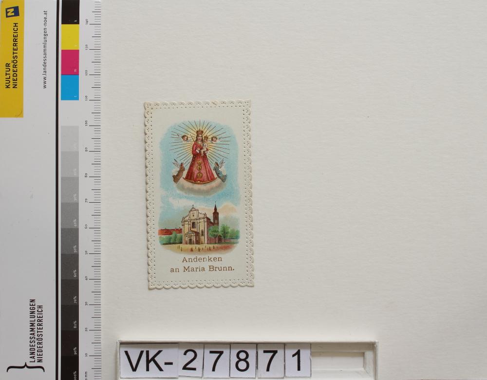 Mariabrunn in Wien-Penzing; Vorderseite: Gnadenstatue = Maria mit Kind, Wallfahrtskirche, Engel, Engelsköpfe, "Andenken an Maria Brunn"; Rückseite: "Gebet", "Druckerlaubnis Bamberg 12. Juni 1903, Maurer Generalvikar", "Verlag von F. Kriegsauer Wien"
