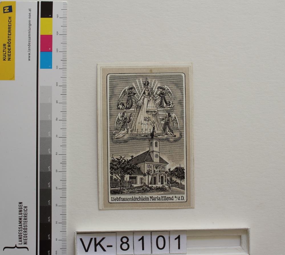 Haslau - Maria Ellend, "Maria an der Straße"; Vorderseite: Gnadenstatue = Maria mit Kind, Wallfahrtskirche, Engel, "Liebfrauenkirchlein Maria Ellend a./d. Donau"; Rückseite: Gebet, "Andenken an die heilige Mission (7. bis 17. September 1911) in Maria Ellend a. d. Donau bei Fischamend", "Verlag von Joseph Berghold, Liebfrauenpfarrer in Maria Ellend"; Eintrag Inventarbuch: Gebetszettel, Slg. Klar.