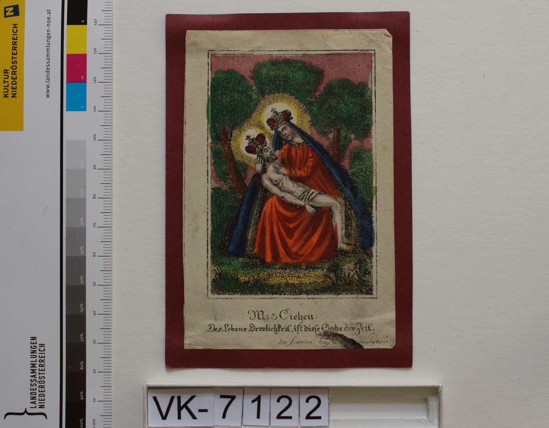 Maria Dreieichen; Vorderseite: Gnadenstatue = Pietà, "M: 3 Eichen/ Des Lebens Herrlichkeit, ist diese Gabe der Zeit/ zu finden bey xxxxxx"; verklebt auf Karton; Eintrag Inventarbuch: "Andachtsbild, Lithografie, coloriert, Slg. Klar."