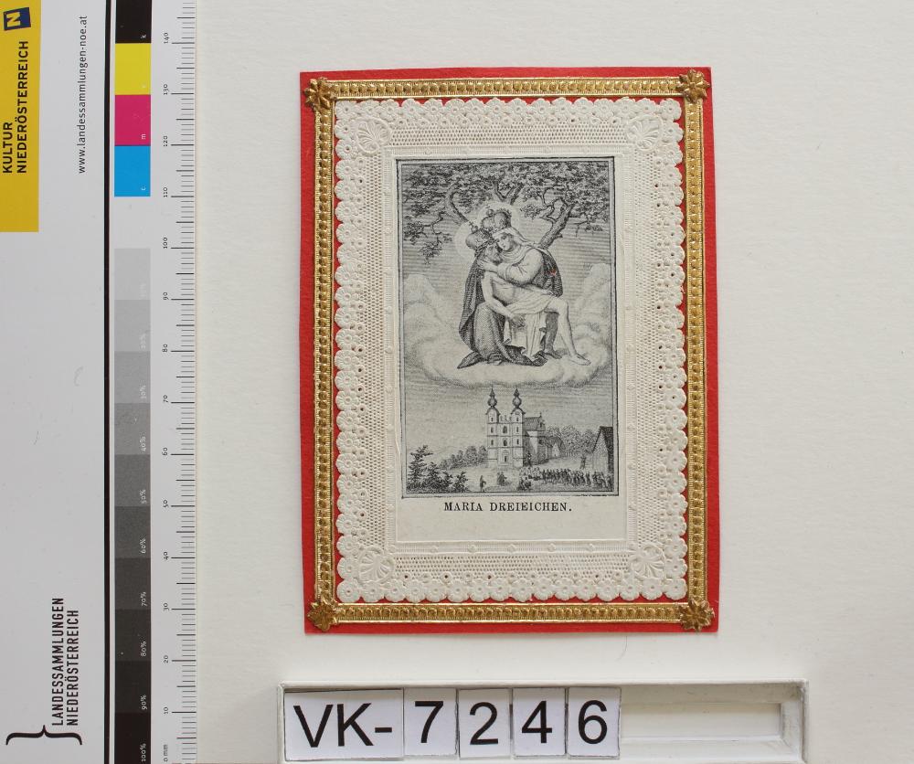 Maria Dreieichen; gefaltet; Vorderseite: Gnadenstatue = Pietà, Basilika, "Zum Andenken an die Basilika-Erhebung Maria - Dreieichen"; Innenseiten und Rückseite: "Aus dem Schreiben Papst Pius XII. zur Erhebung der Basilika Maria-Dreieichen", Gebet, handschriftlich: "1.V.58/ P. Ludw. Rabensteiner"; Eintrag Inventarbuch: "Gebetszettel, Druck, Slg. Klar."