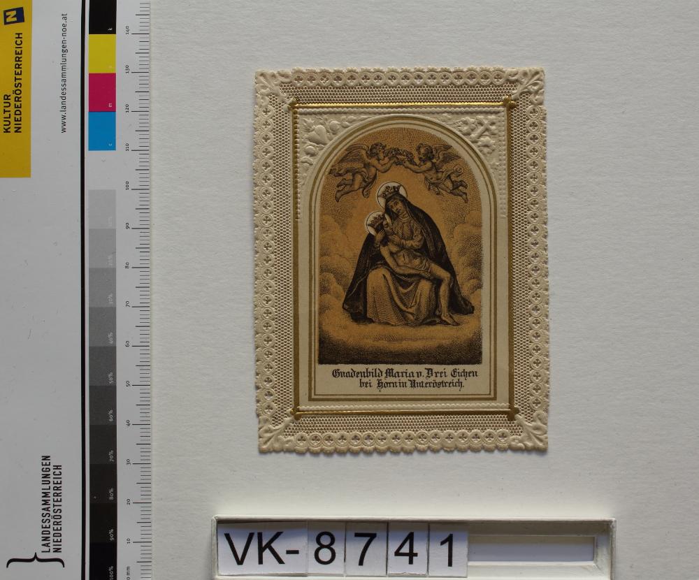 Maria Dreieichen; Vorderseite: Gnadenstatue = Pietà, Puti, "Gnadenbild Maria v. Drei Eichen bei Horn in Niederösterreich"; Rückseite: Gebet "Zum frommen Andenken", "Bei A. Schaufele Stuttgart"; Eintrag Inventarbuch:Wallfahrtsbildchen, Maria Dreieichen, Slg. Klar.