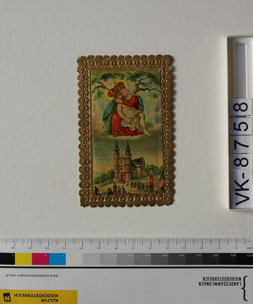 Maria Dreieichen; Vorderseite: Gnadenstatue = Pietà, Basilika; Rückseite: Gebet "Andenken an Maria Drei Eichen; Eintrag Inventarbuch: Wallfahrtsbildchen, Maria Dreieichen, Slg. Klar.