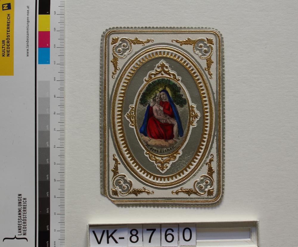 Maria Dreieichen; Vorderseite: Gnadenstatue = Pietà, "M drei Eichen"; Eintrag Inventarbuch: Wallfahrtsbildchen, Maria Dreieichen, Slg. Klar.