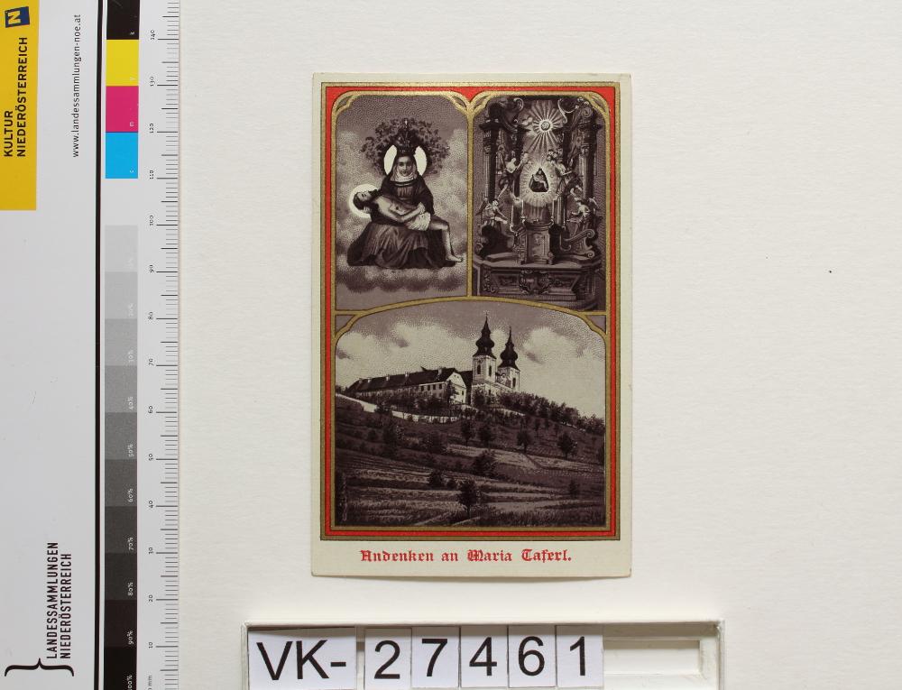 Maria Taferl; Vorderseite: Gnadenstatue = Pietà, Basilika, Altar, "Andenken an Maria Taferl"; Rückseite: "Gebet zu Maria, der glorw. Mutter des Herrn", "Verlag von Gregor Fischer Innsbruck"