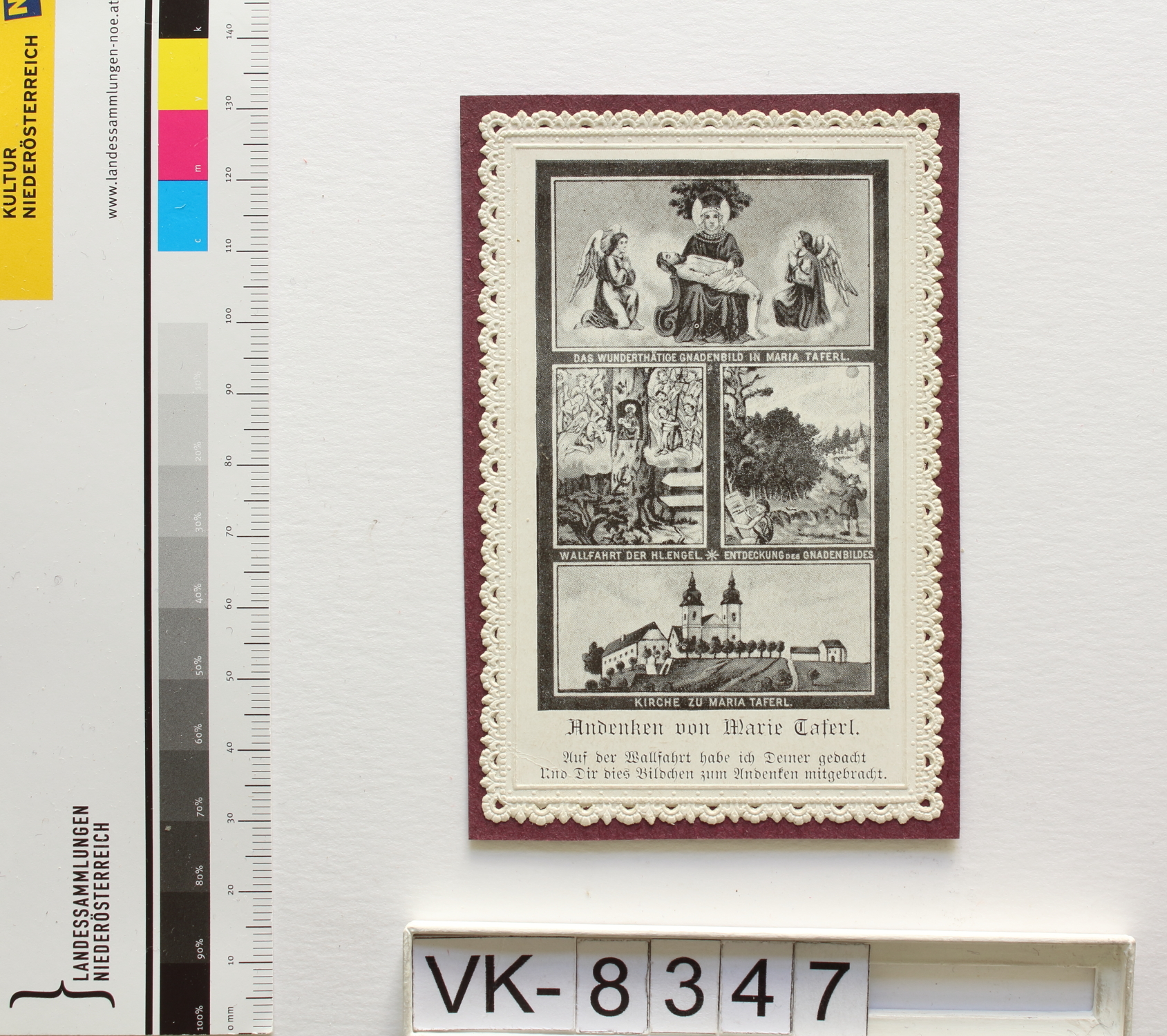 Maria Taferl; Vorderseite: Gnadenstatue = Pietà, Basilika, Engel, Gnadenbild "Das Wunderthätige Gnadenbild zu Maria Taferl", "Wallfahrt der Hl. Engel", Entdeckung des Gnadenbildes", Kirche zu Maria Taferl", "Andenken von Maria Taferl", "Auf der Wallfahrt hab ich an dich gedacht und dir dies Bildchen zum Andenken mitgebracht"; Rückseite: Gebet "Hingabe an Maria"; verklebt auf Karton; Eintrag Inventarbuch: "Gebetszettel, Slg. Klar."